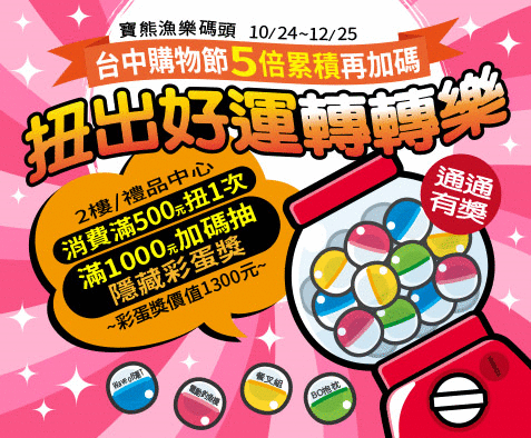 最新消息 News & Events 2025台中購物節X扭出好運轉轉樂 最新優惠 台中購物節~就是愛購物,好吃好玩好划算、送車送房大放送。10/24~12/25『寶熊漁樂碼頭』消費金額五倍「再加碼」2樓/禮品中心,消費滿500元扭1次、滿1000元加碼抽隱藏彩蛋獎~彩蛋獎價值1300元... 2025-10-21 慢蚵生活-蚵再生杯墊.限定體驗 活動公告 寶熊漁樂碼頭~把廢棄蚵殼轉化為創意素材,來場結合永續、在地文化、與個人風格的文創體驗;感受蚵農精神,在城市中重新連結大海的記憶... 2025-05-02